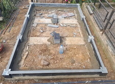 Укрываем внутреннюю зону участка геотекстилем и приносим три массивные прямоугольные плиты, которые в дальнейшем послужат наземным покрытием могилы.