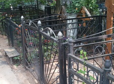 Могила стандартная, не большая. Когда-то здесь стоял гранитный памятник и была высокая ограда. После очередного захоронения плиту убрали в сторону, цветник тоже подняли, переднюю часть ограду демонтировали, установили временный крест.